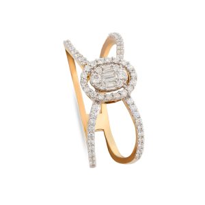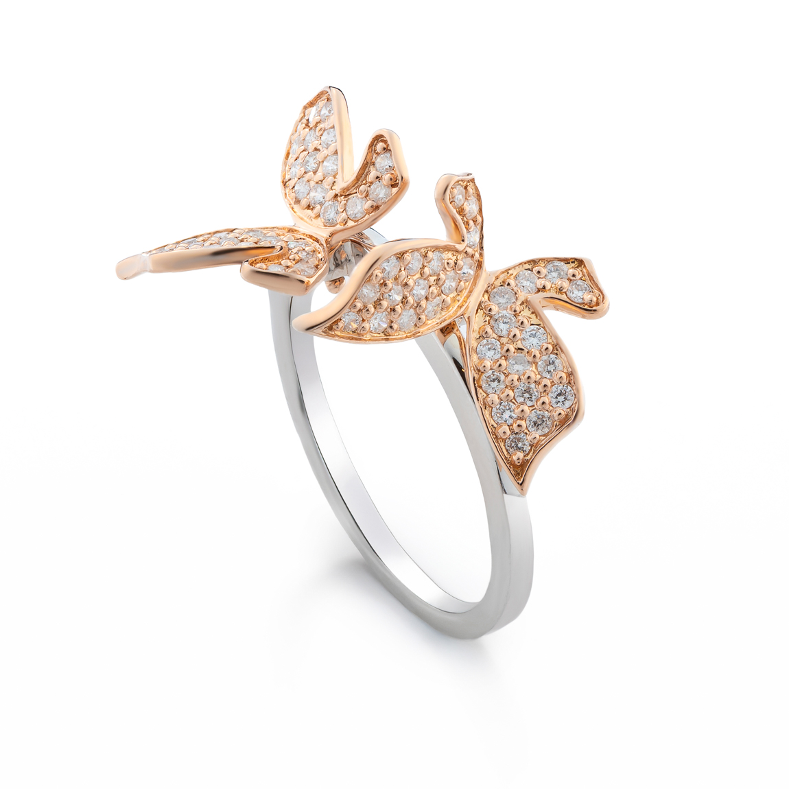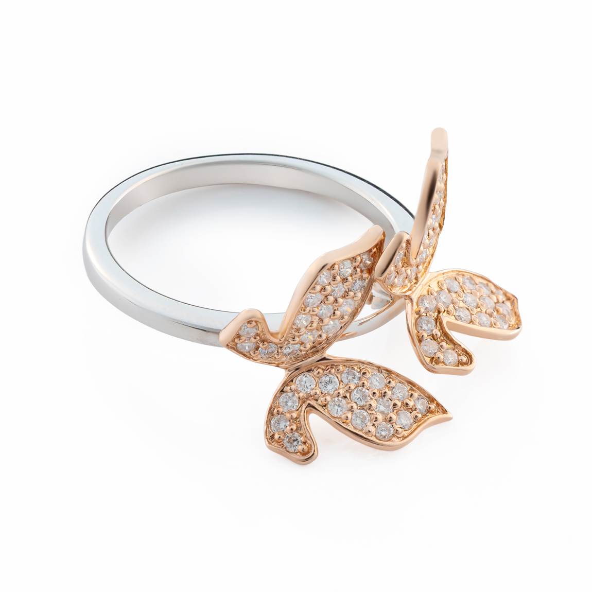 Luxury Diamond Ring from Benyan Jewelry, crafted from 18K white gold. The centerpiece of the ring features two flying butterflies made of 18K yellow gold, adding a delicate touch of beauty and elegance. The butterflies are adorned with round brilliant-cut diamonds, enhancing the sparkle and brilliance of the design